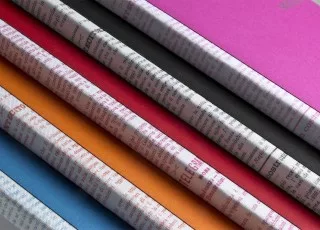 該產品有5種顏色可供選擇。書背採用布包並印有義大利報紙細節的字樣,每本筆記本都各不相同。